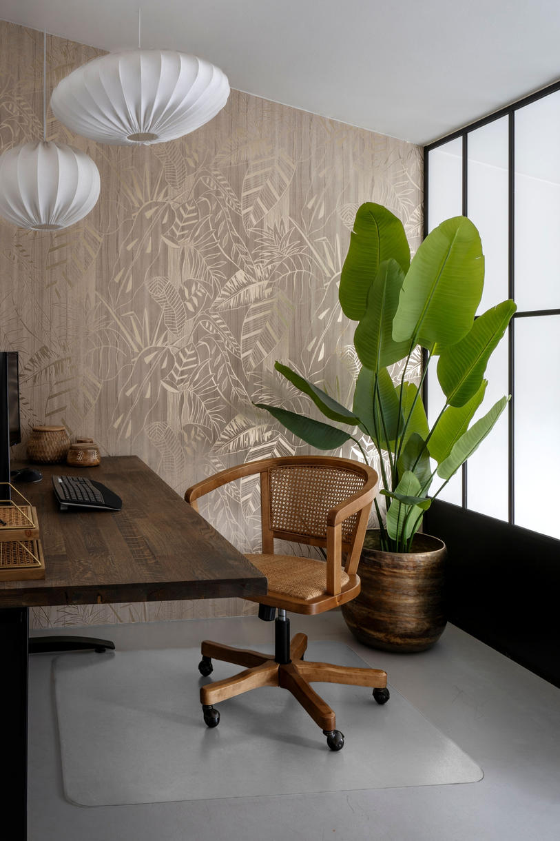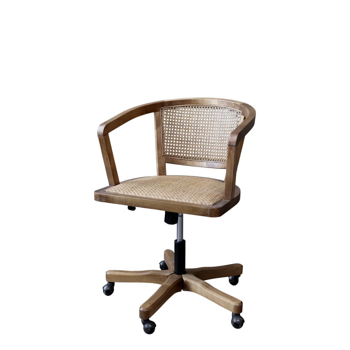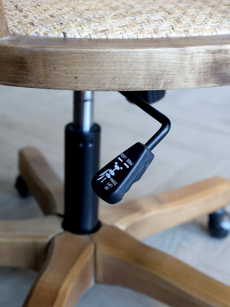 Fransk inspireret kontorstol i massivt træ med fletsæde og ryg, som kombinerer klassisk håndværk med funktionelt design. Det naturlige flet giver et let og luftigt udtryk, samtidig med at stolen fremstår robust og stabil.