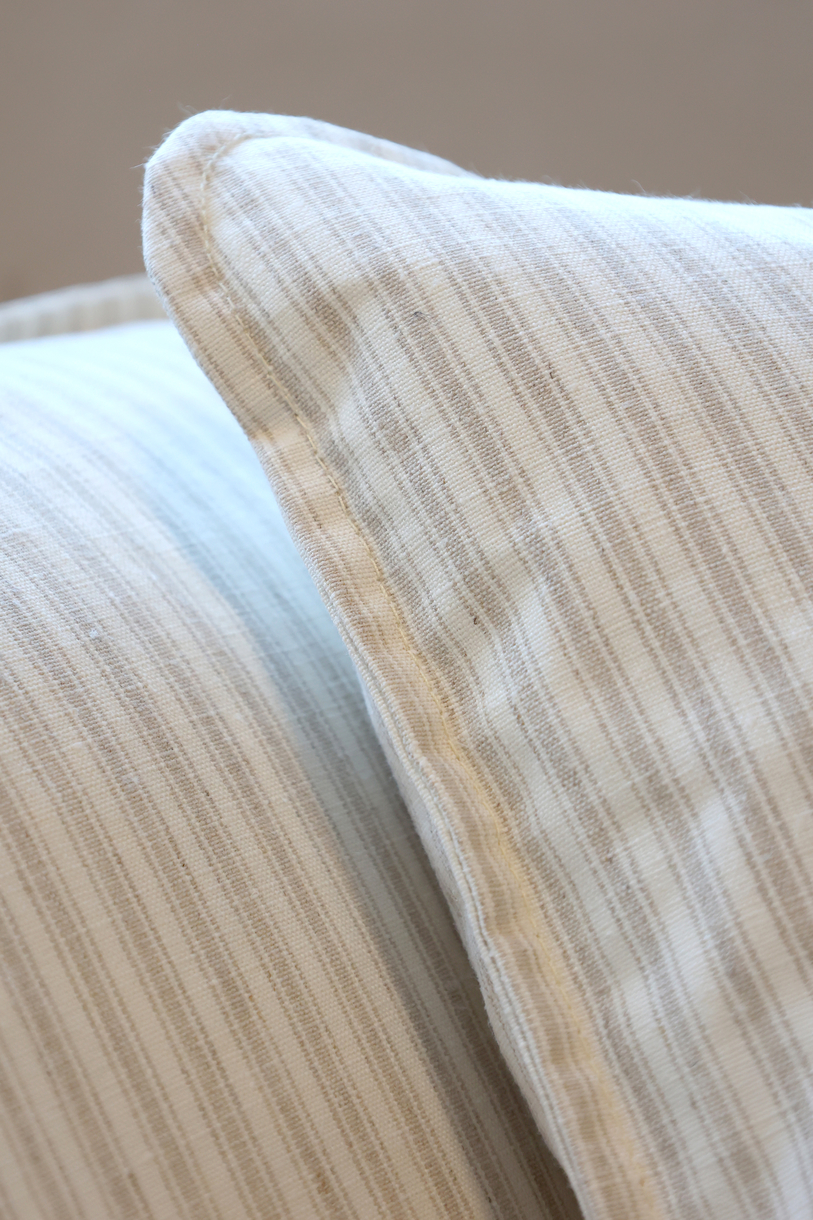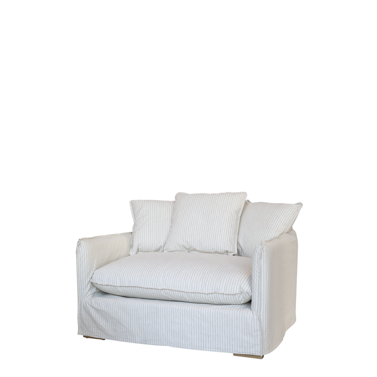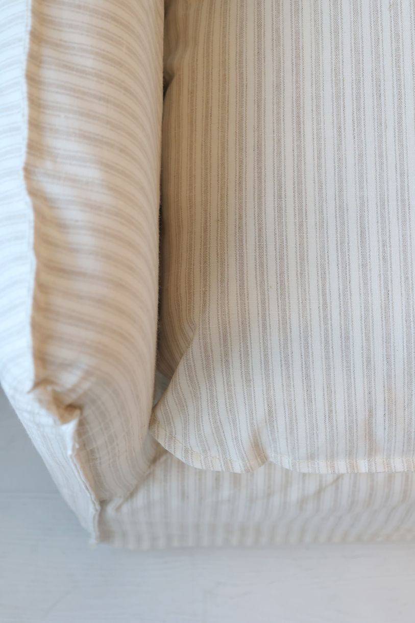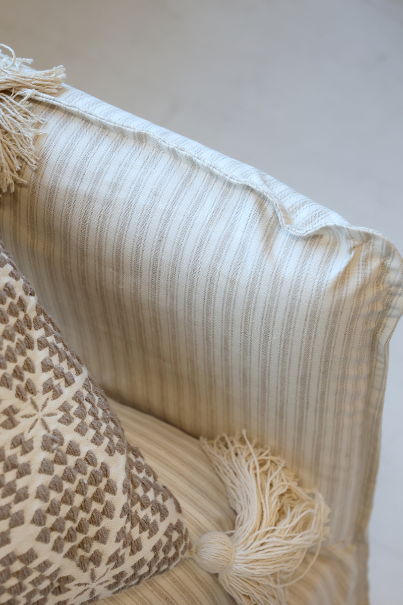 Komfortabel lænestol i hør med bløde puder og naturligt udtryk.