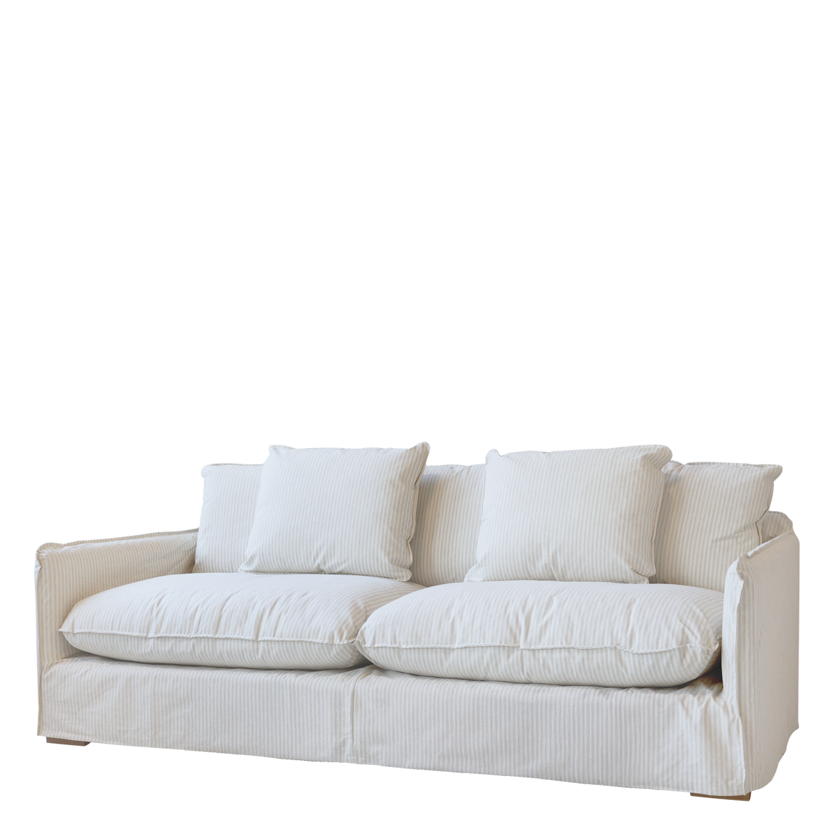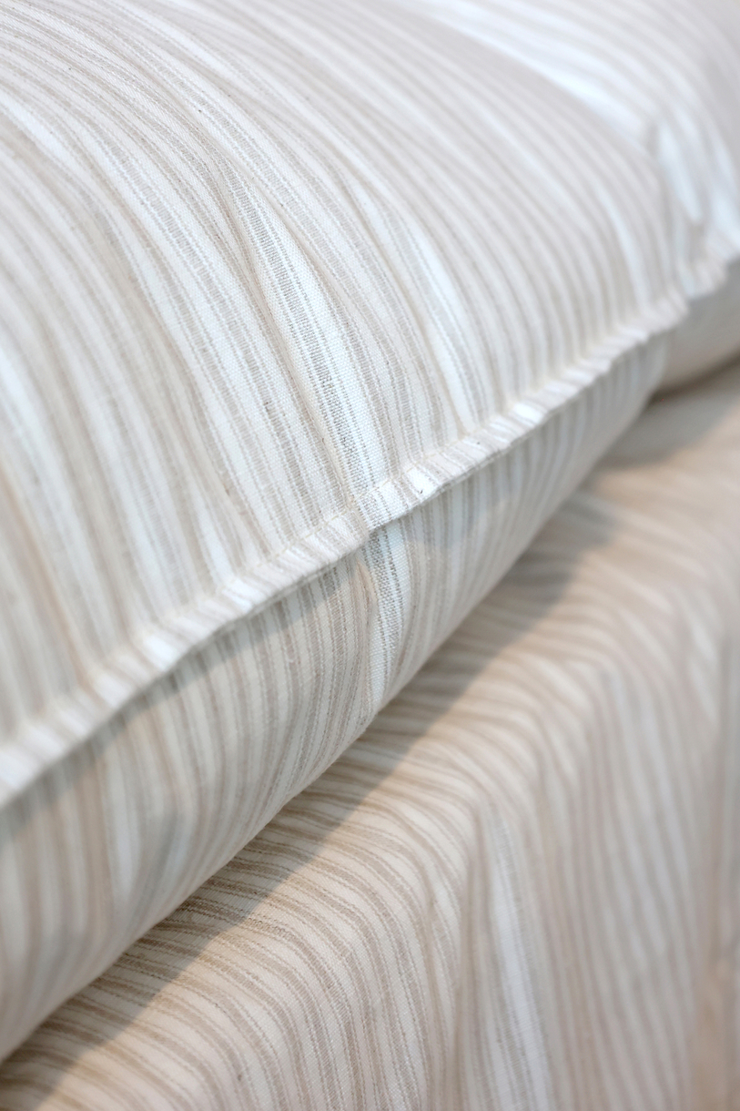 Rummelig sofa i hør med bløde puder og naturligt udtryk.
