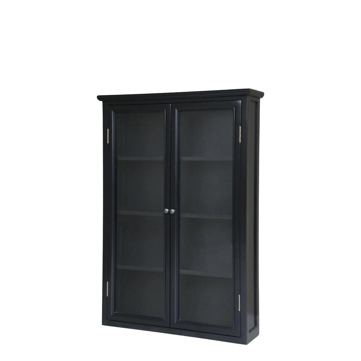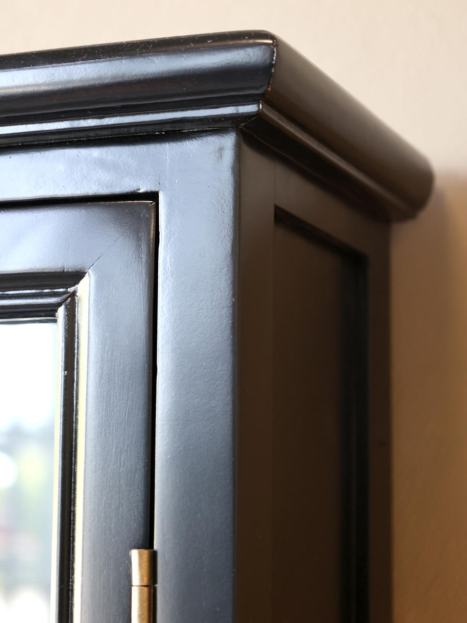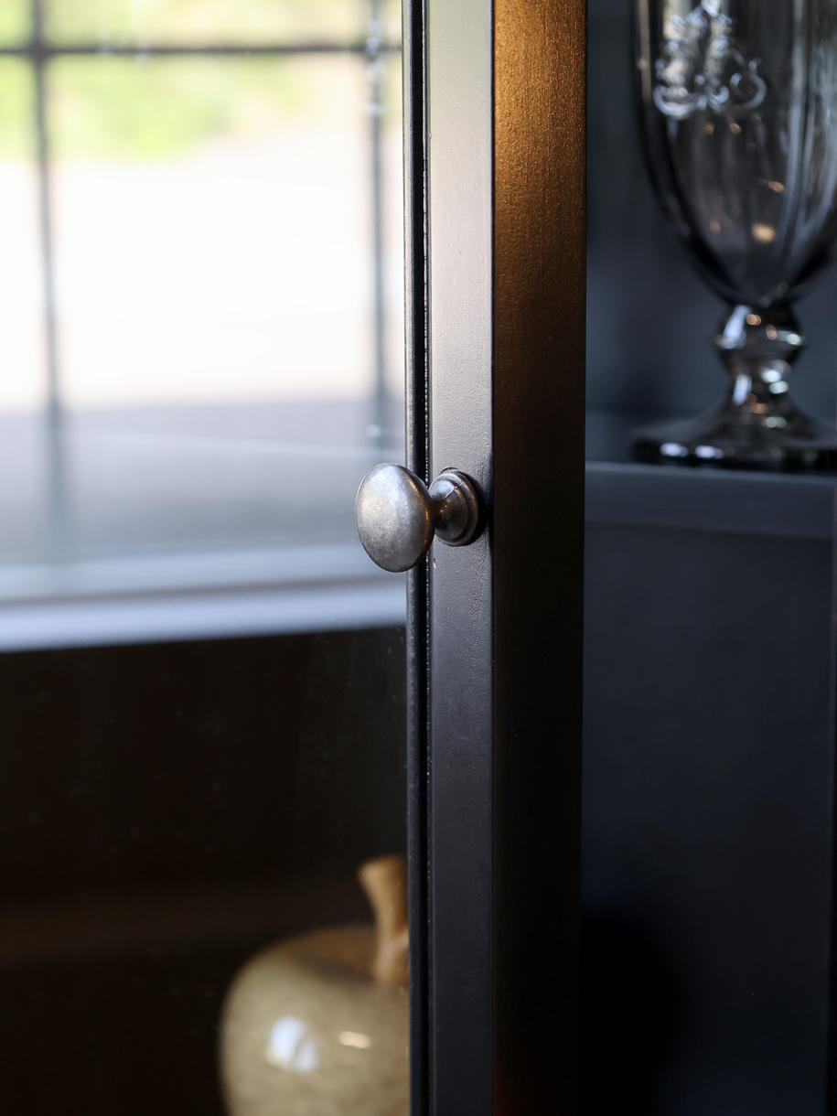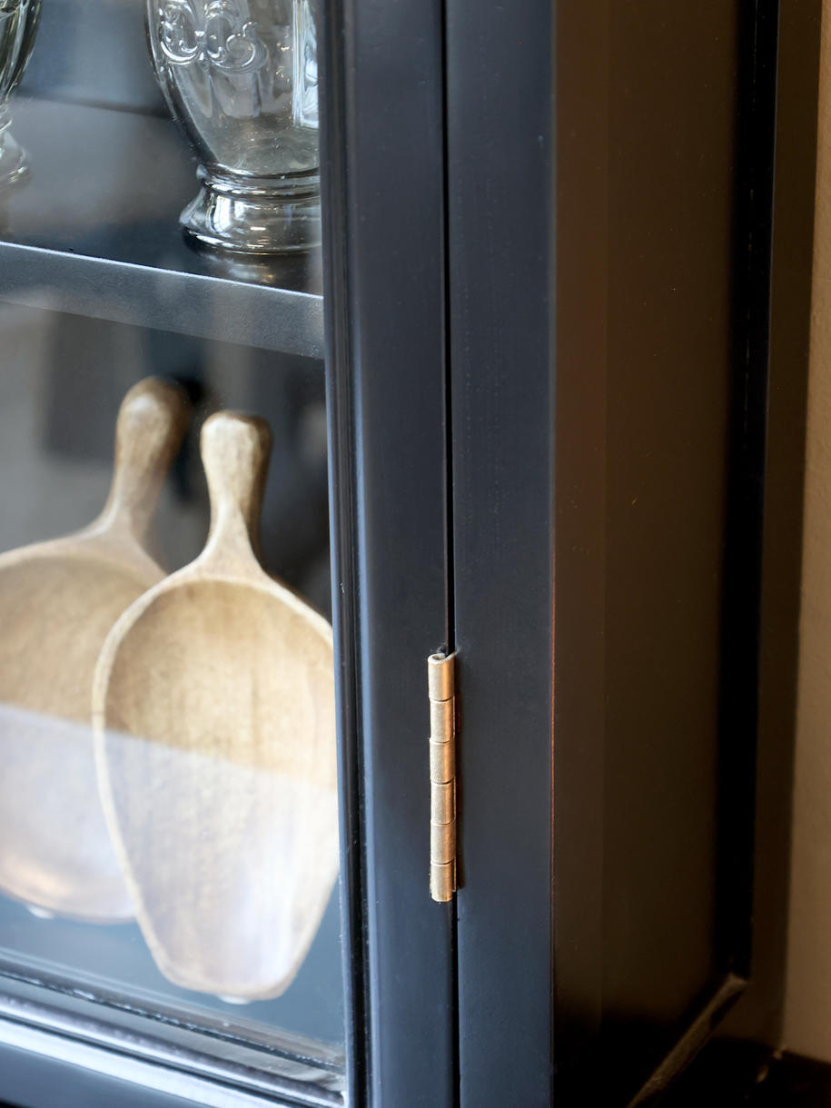 Til indendørs brug. Materiale Poppel, Glas, Finér. Væghængt Marseille vitrineskab fra Chic Antique er en elegant og pladsbesparende fortolkning af den franske landstil. Skabet er håndlavet i massivt poppeltræ med en sortlakeret overflade, der giver det et let og indbydende udtryk. Med fire hylder og to slanke glaslåger får du rig mulighed for at fremhæve dine mest skattede yndlingsting – fra fint porcelæn og glas, til dekorative genstande i alle rum.