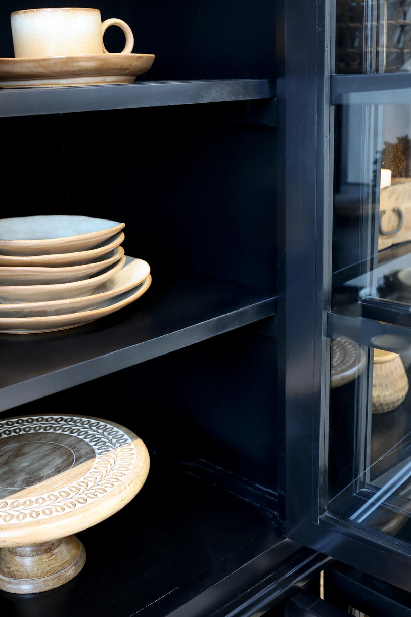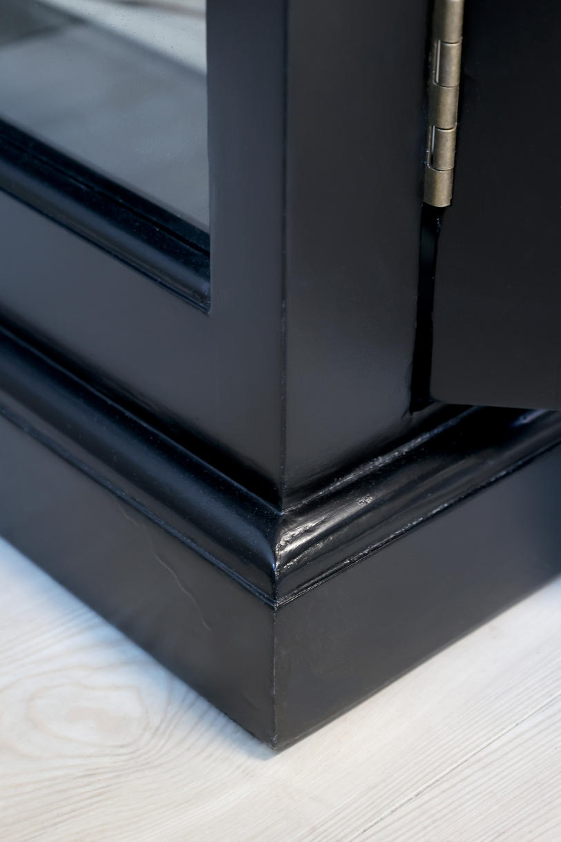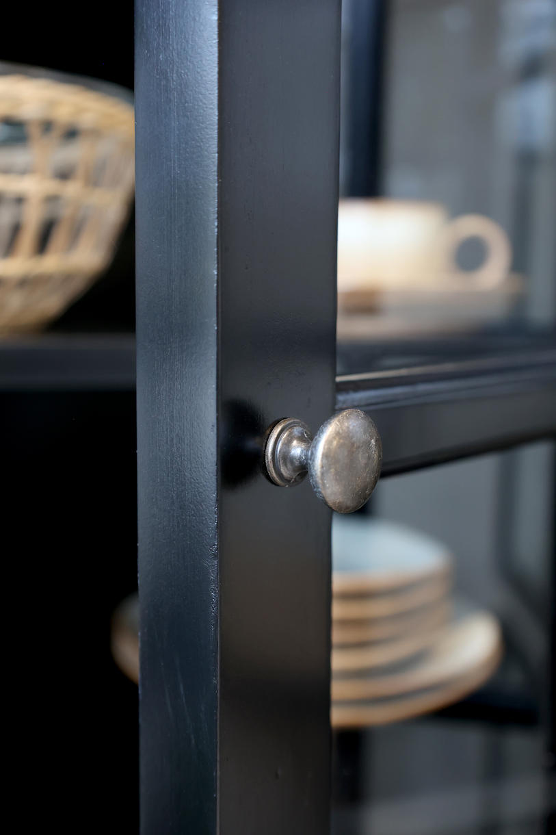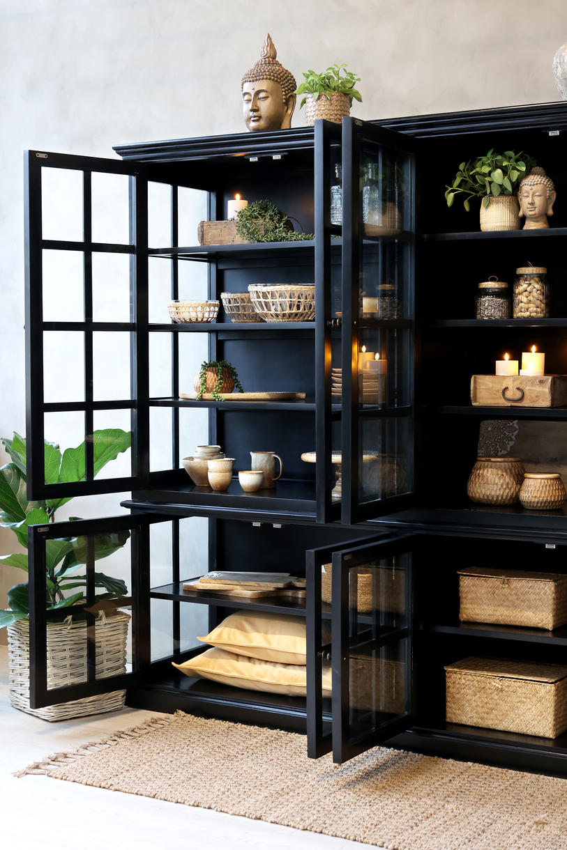 | Til indendørs brug. Materiale Poppel, Krydsfiner, Glas. Det sorte Marseille vitrineskabet fra Chic Antique er en elegant fortolkning af det populære Marseille design, udført i massiv poppeltræ og lakeret i en smuk, dyb sort. Dette giver skabet et sofistikeret og moderne udtryk, samtidig med at det bevarer den franske landstils klassiske charme. Med otte glaslåger og tilhørende hylder har du rigeligt plads til at fremvise porcelæn, glas eller dekorative elementer, mens den sorte overflade indrammer dine yndlingsgenstande på en stilfuld måde. Det robuste træ og de fine detaljer sikrer et tidsløst look, der nemt passer ind i både stue, spisestue og køkken. Skabet er håndlavet og kvalitetspræget, hvilket gør det til en solid og varig investering i din boligindretning. Den sorte Marseille-model er det ideelle valg for dig, der ønsker et statement-møbel med både praktisk opbevaring og en elegant fremtoning.
