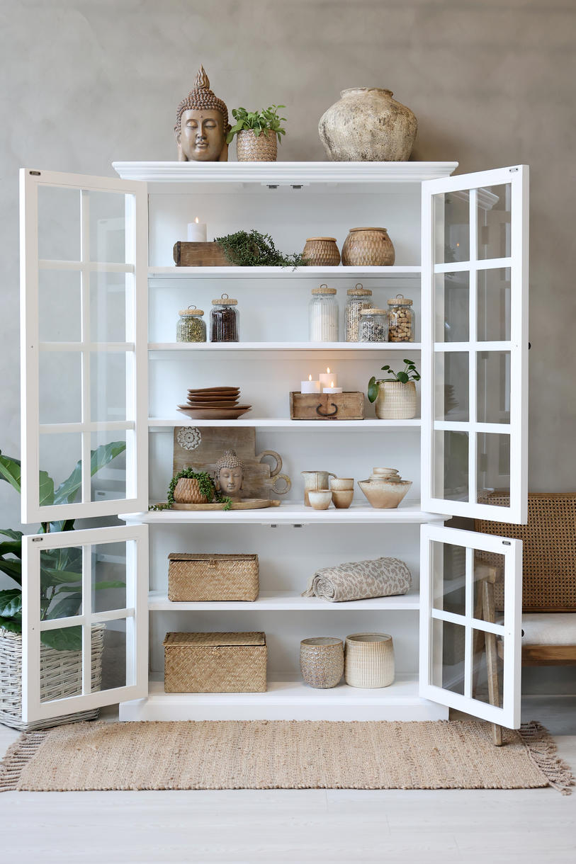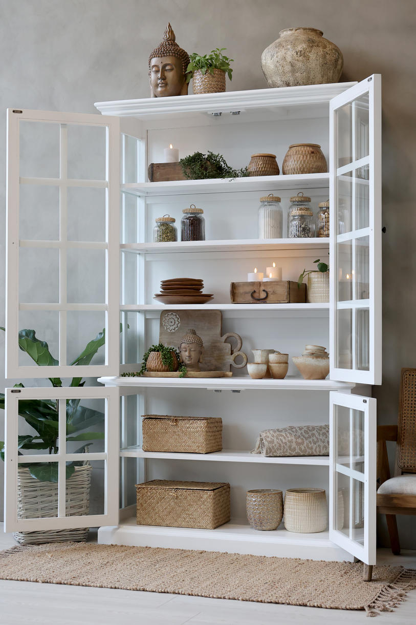 De fire glaslåger åbner op til rummelige hylder, hvor du kan fremvise alt fra porcelæn og glas til dekorative favoritter. Det hvide look fremhæver de klassiske linjer, og passer nemt ind i både moderne og romantiske indretninger. Med sin slanke form, giver dette Marseille-skab en praktisk og æstetisk opbevaringsløsning, der kombinerer vintageinspireret charme med en nutidig og stilfuld fremtoning.