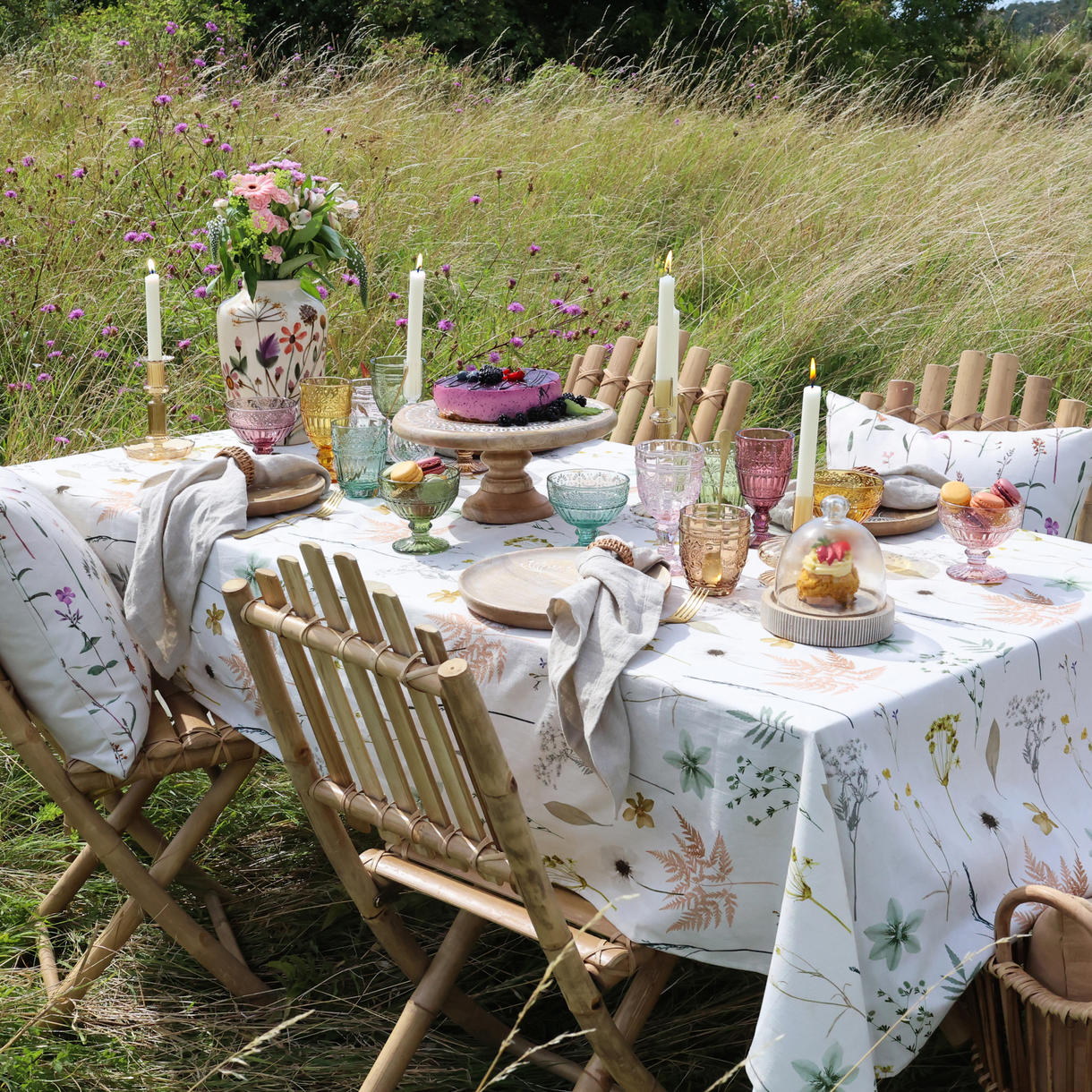 Bomuldsdug med blomsterprint til en let og stemningsfuld borddækning.