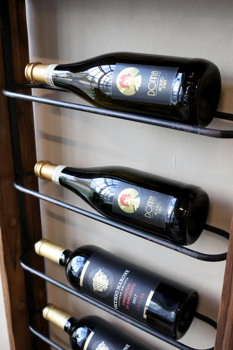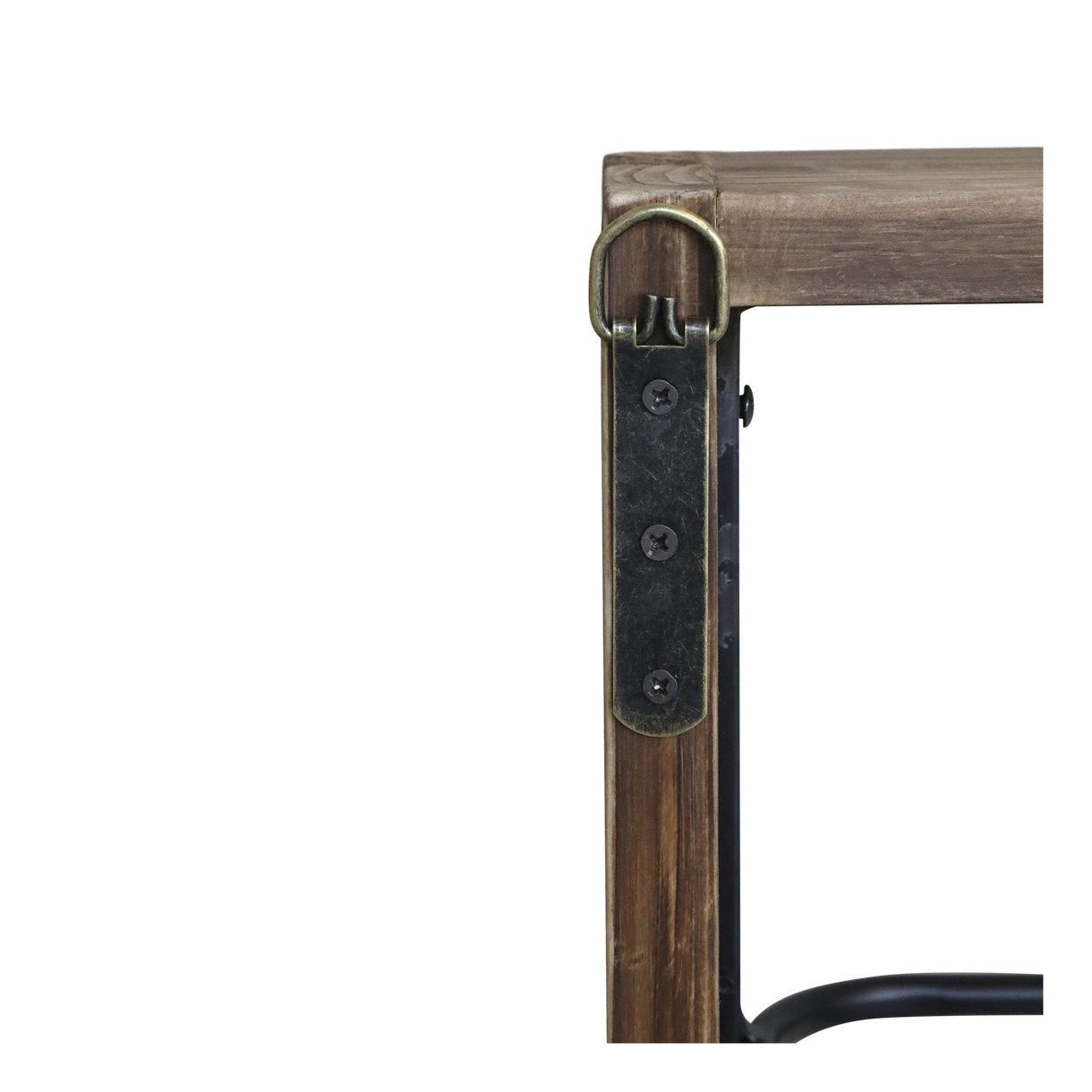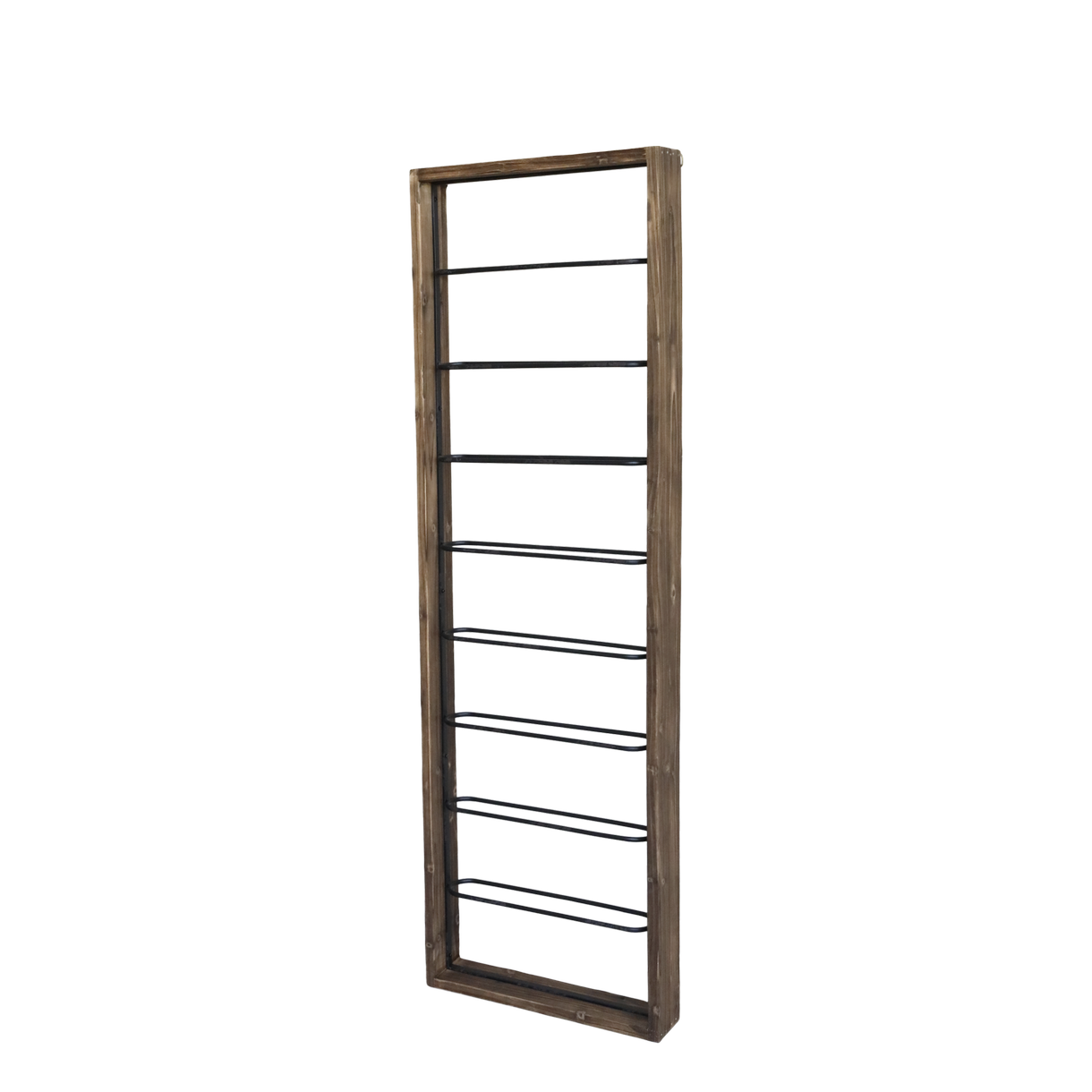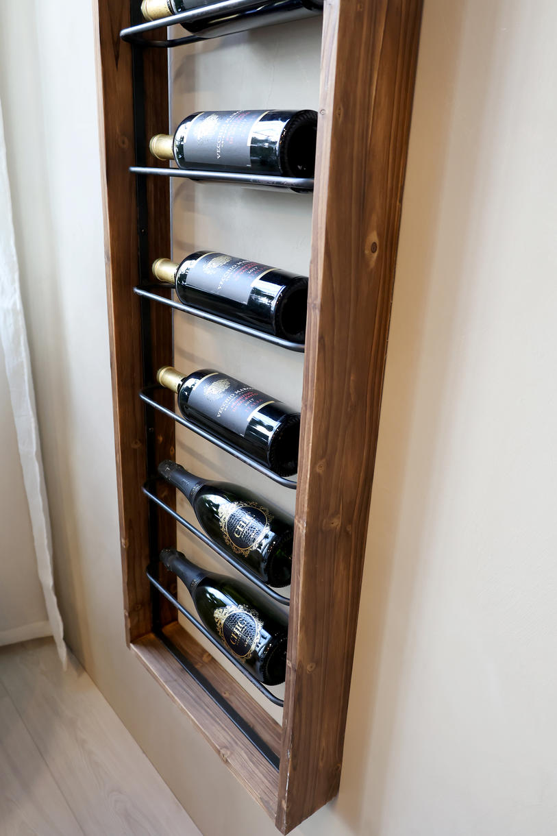 | Til indendørs brug. Materiale Jern, Genanvendt Grantræ. Afstand imellem hylder er 15 cm, Passer til 8 flasker | |