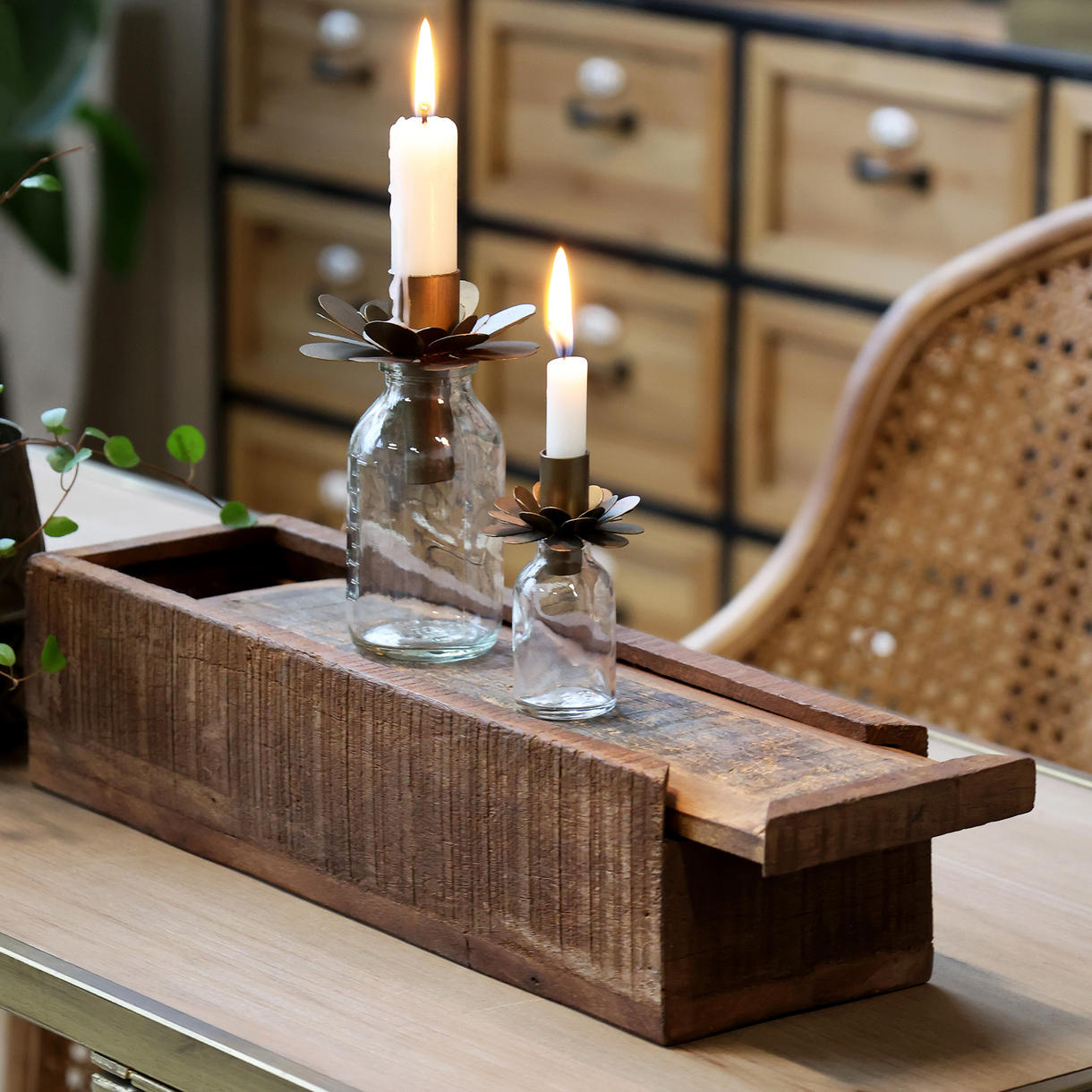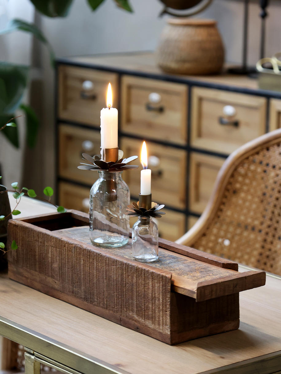 | Grimaud-serien Grimaud-kollektionen er en samling at unikke værker - gamle artefakter og varer lavet af smukt patineret genbrugstræ. Og det medvirker til at tilføje både varme, sjæl og historie til hjemmet. Kollektionen inkluderer skøn dekor, samt møbler. Ens for al Grimaud er, at man kan se spor og mærker fra dets tidligere liv og formål. At give nyt liv til gamle skatte er hele filosofien bag skabelsen af Chic Antique, og Grimaud kollektionen er indbegrebet af præcis det. Bemærk venligst, at alle Grimaud varer er unikke, og ikke to er ens. Det betyder, at de kan variere i design, størrelse og type af træ. |
