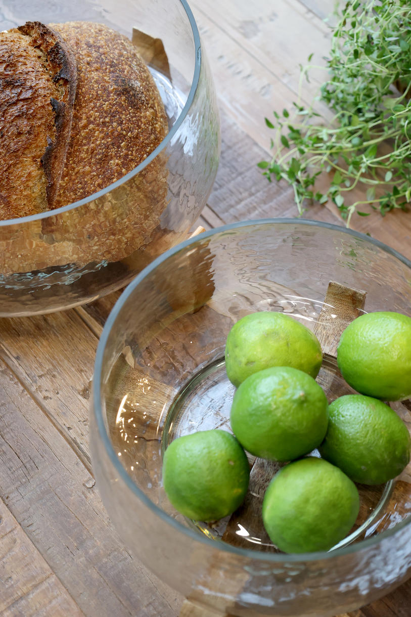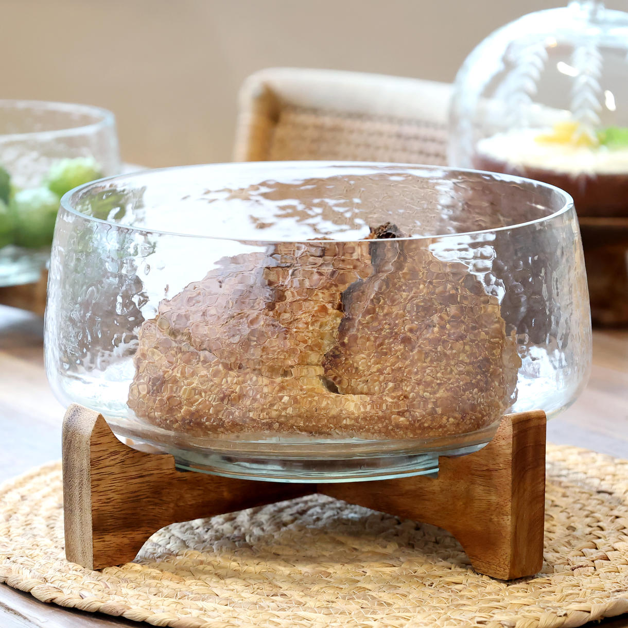 Dekorativt glasfad på træholder perfekt til servering af brød, frugt og snacks.