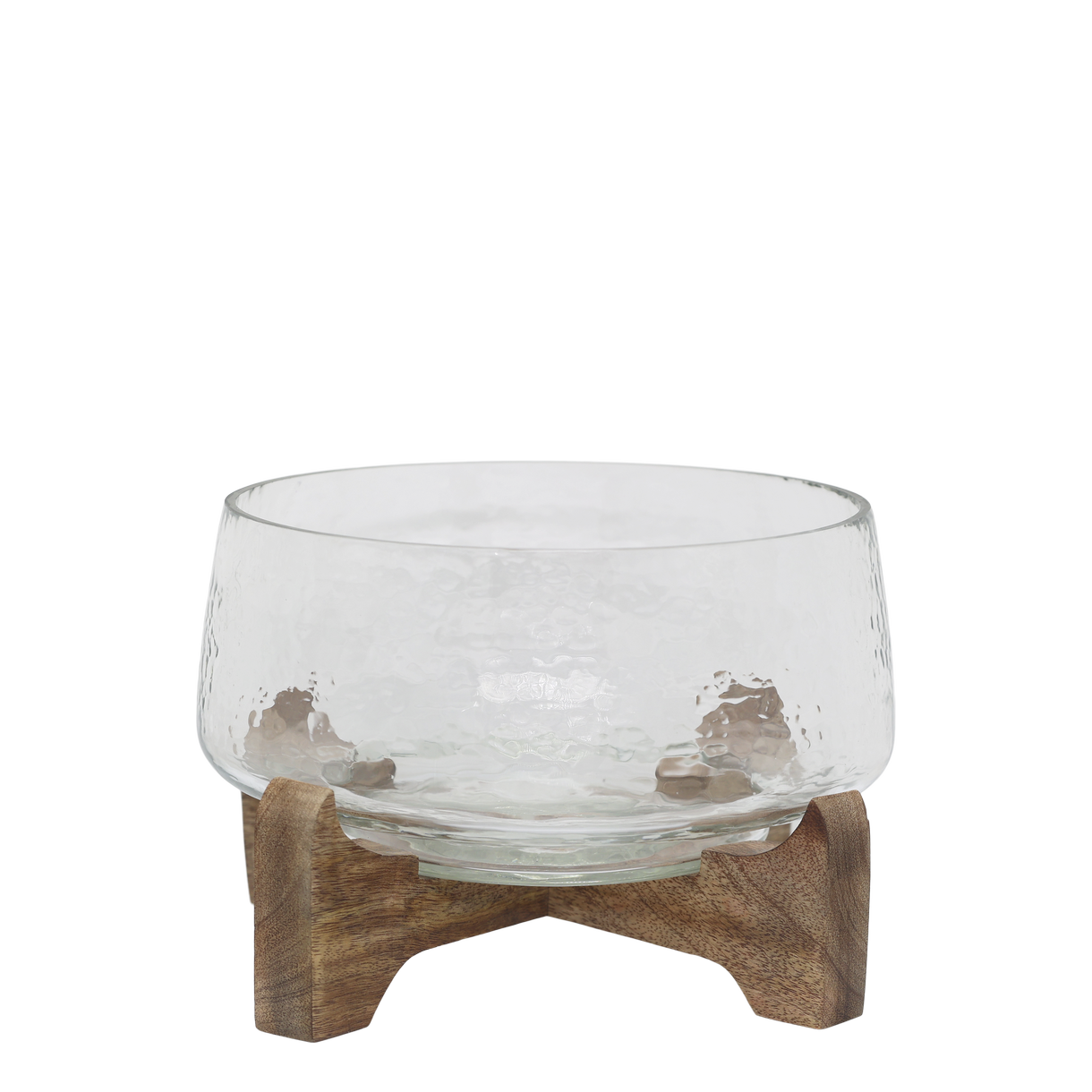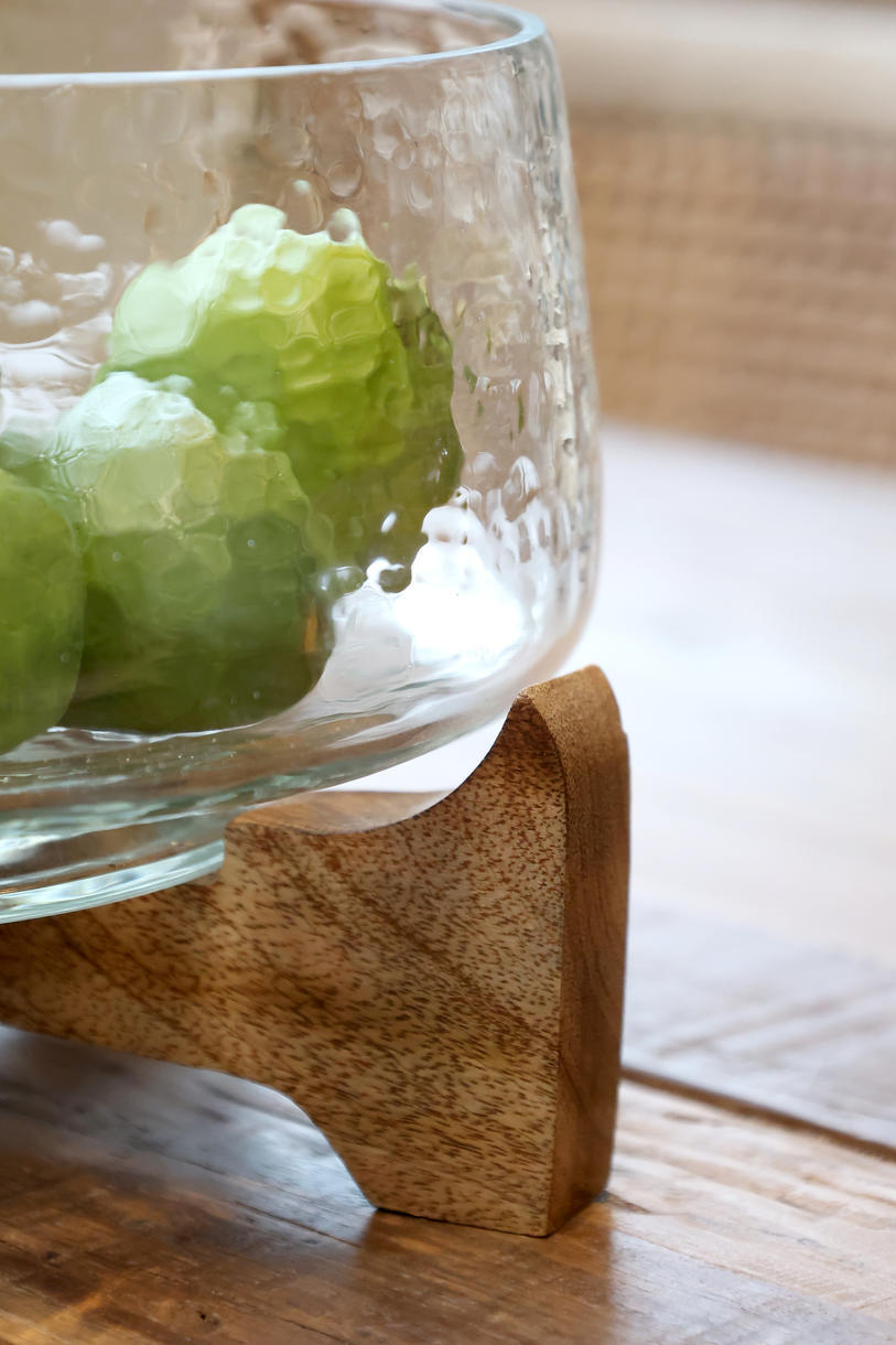Dette mindre glasfad på træholder har et elegant og naturligt udtryk, hvor det klare glas kombineres med en varm base i mangotræ. Designet giver et let og stilfuldt look til din indretning.