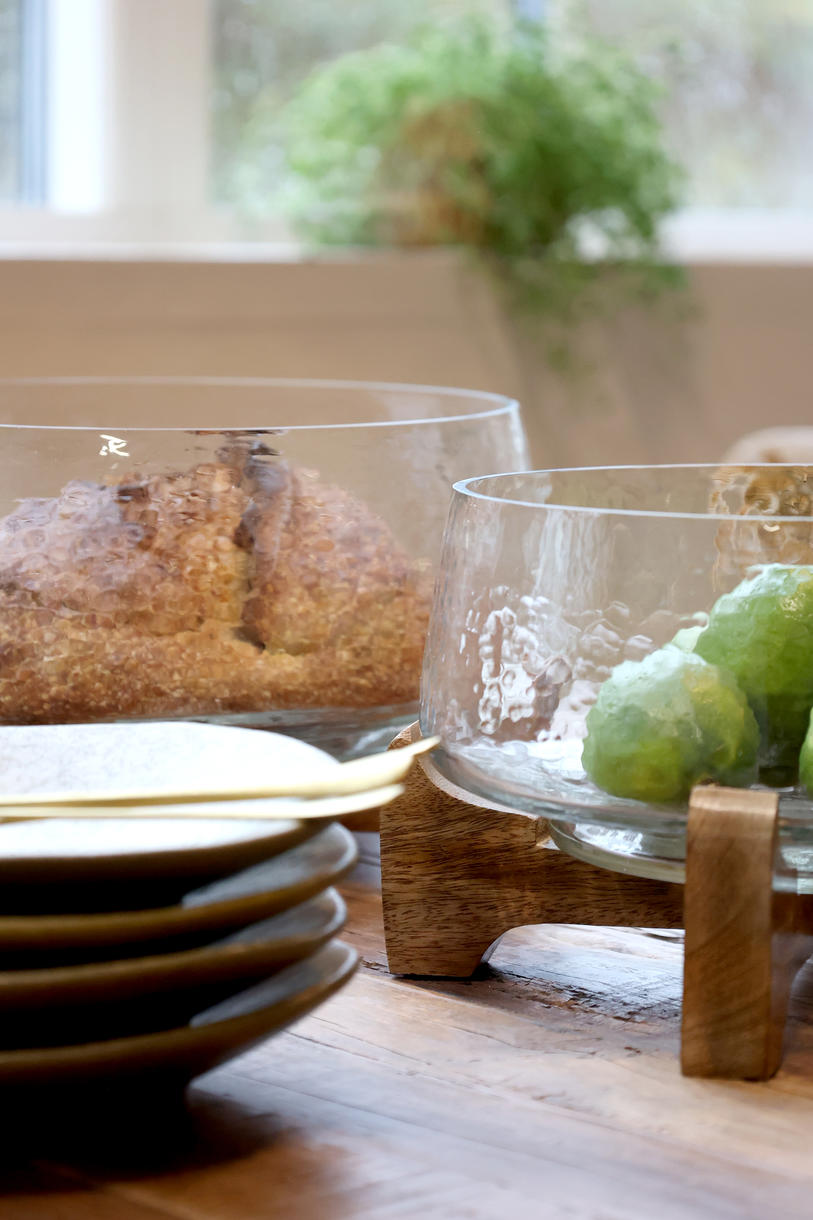 Kompakt glasfad på træholder perfekt til servering og dekorative opstillinger.
