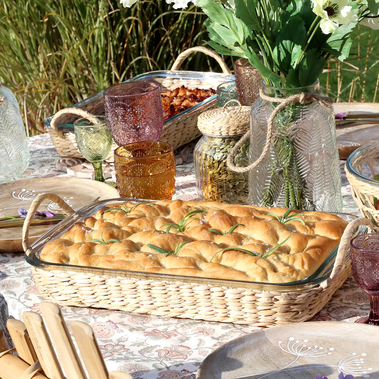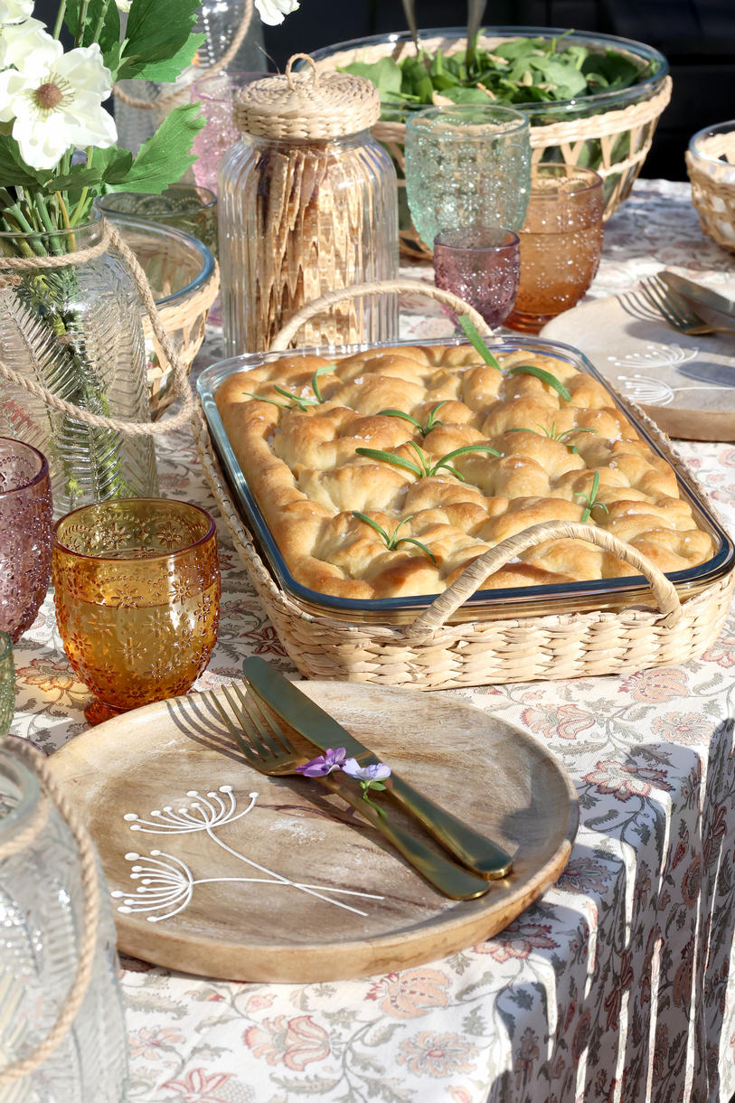 Et dekorativt fad i glas med tilhørende fletkurv, der kombinerer funktionalitet og æstetik. Perfekt til servering af ovnretter direkte på bordet, hvor det naturlige flet tilfører et varmt og rustikt udtryk.
