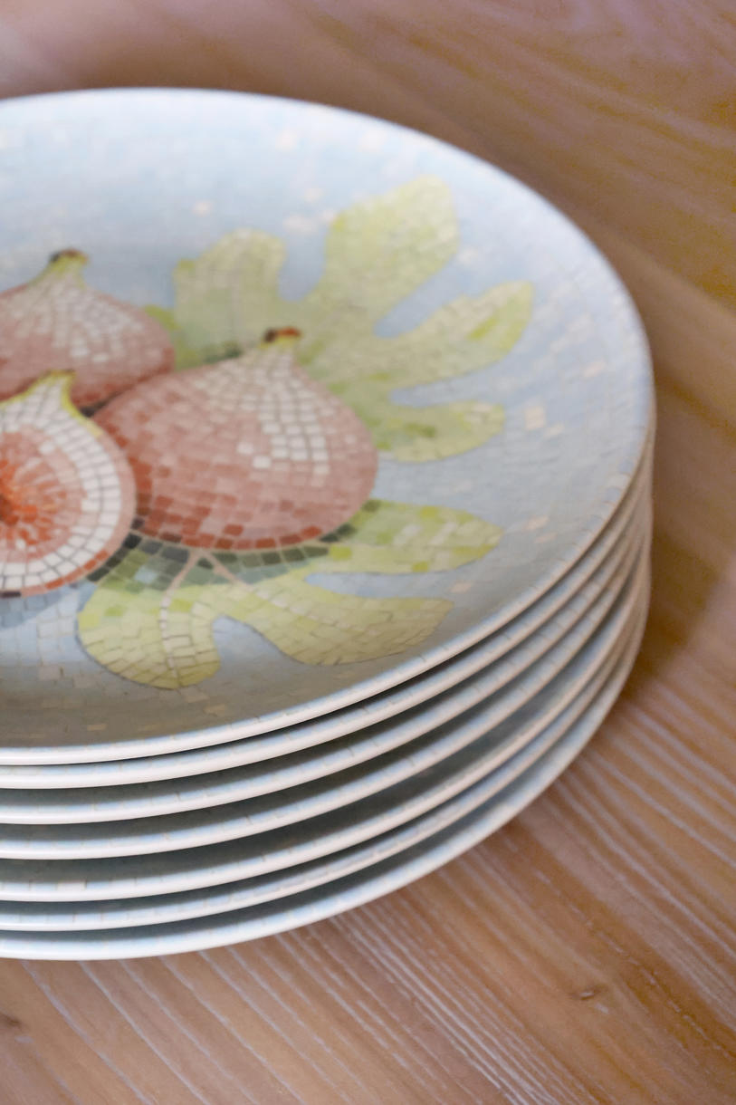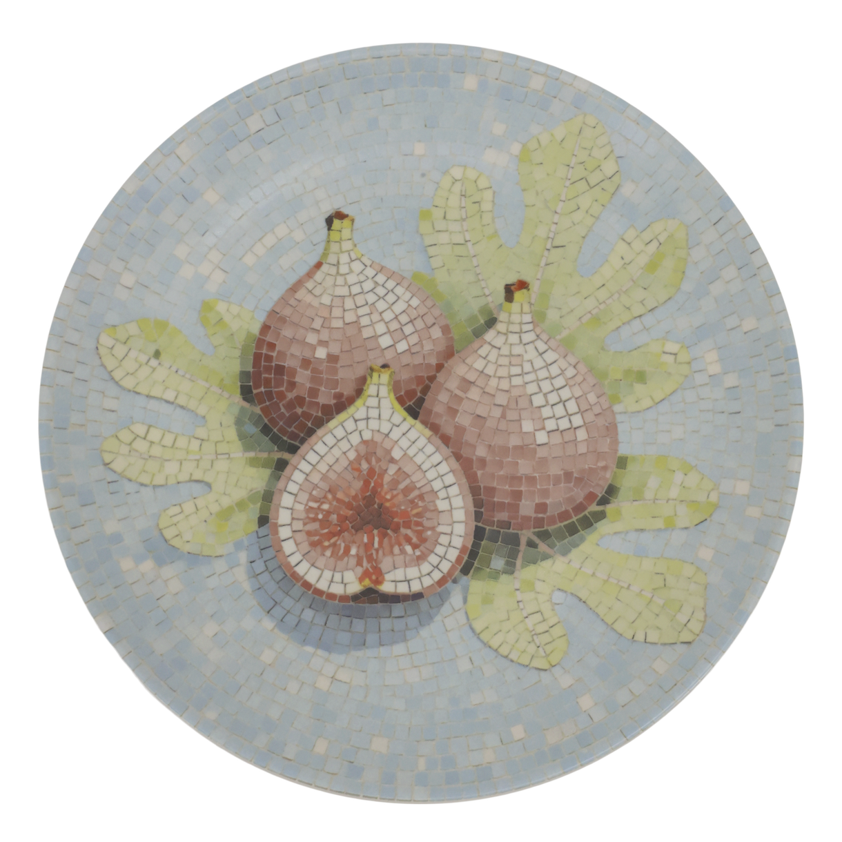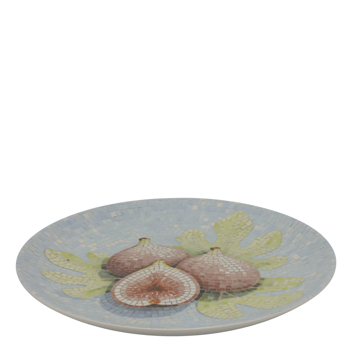 Dekorativt fad i stentøj med smukt mosaikmønster og figenmotiv.