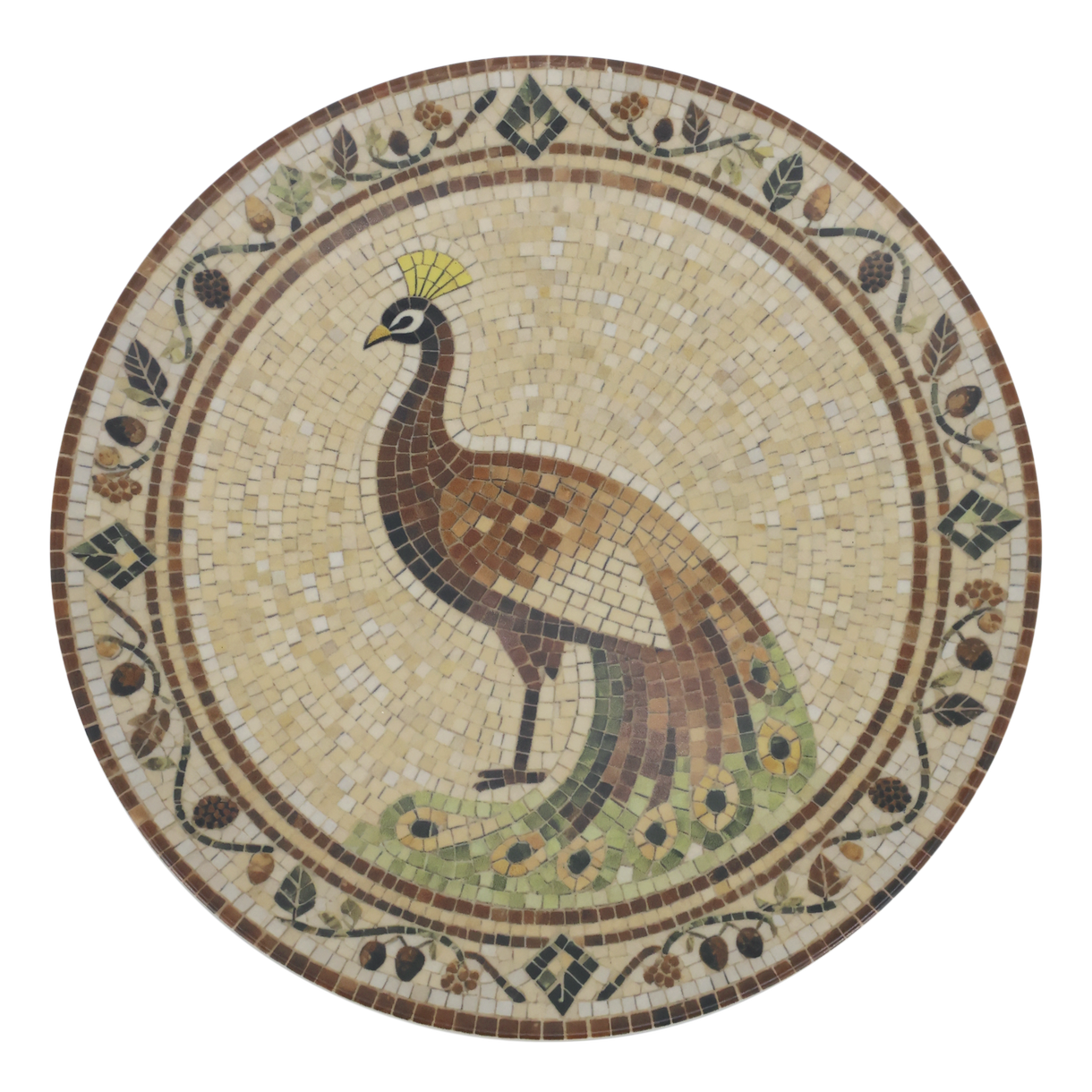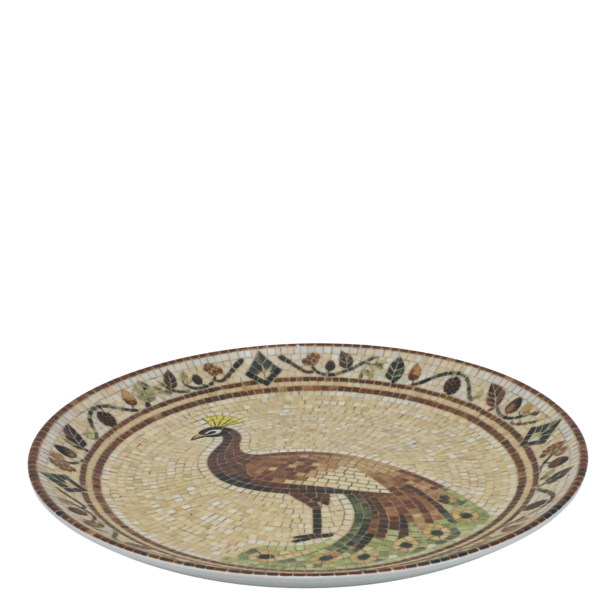 Dette store fad fra Chartres-serien er fremstillet i stentøj og dekoreret med et detaljeret mosaikmønster med påfugl. De varme nuancer i beige og mocca giver et klassisk og roligt udtryk.