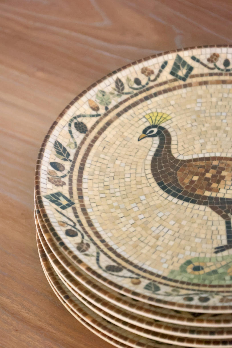Stort dekorativt fad i stentøj med mosaik og påfuglemotiv.