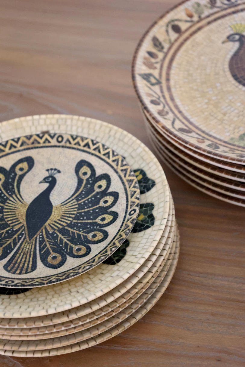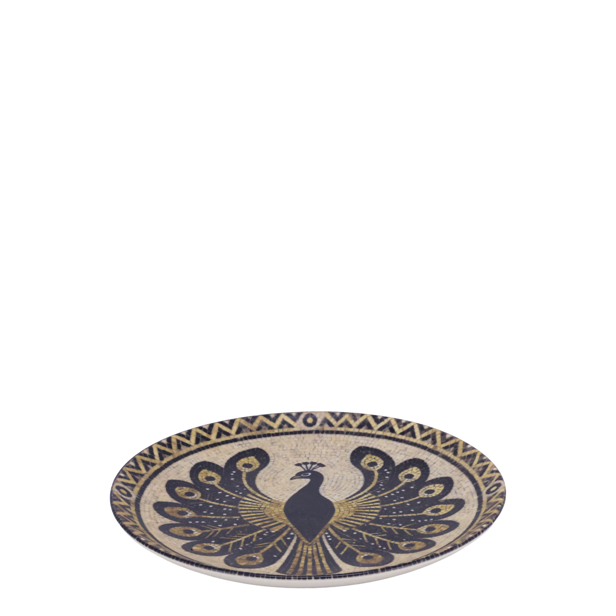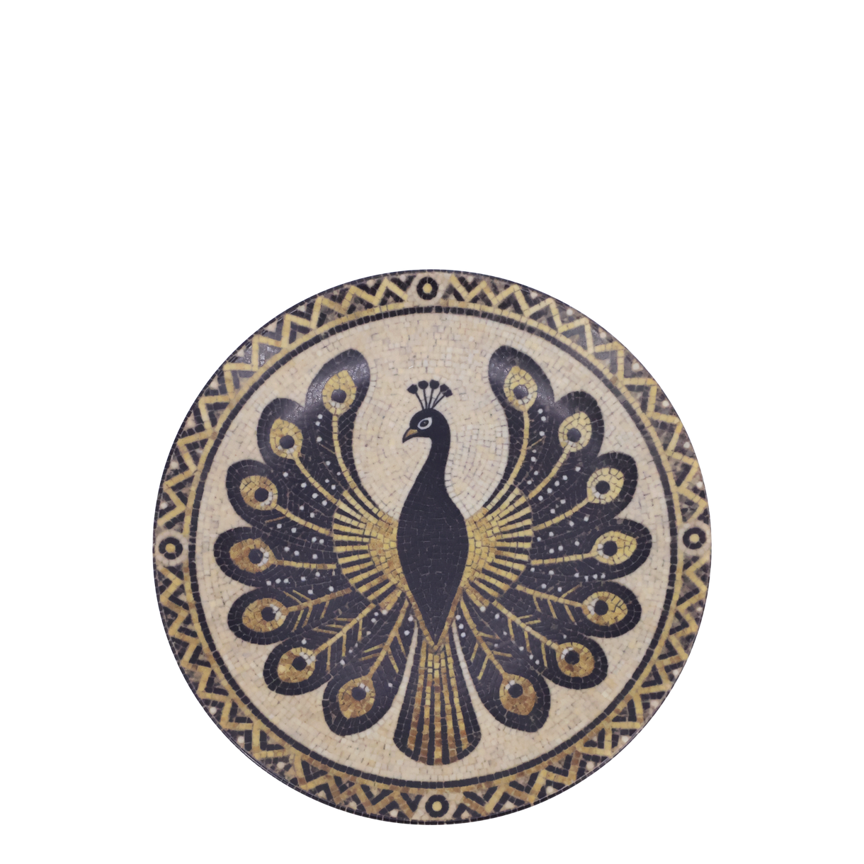 Dekorativt fad i stentøj med mosaik og påfuglemotiv.
