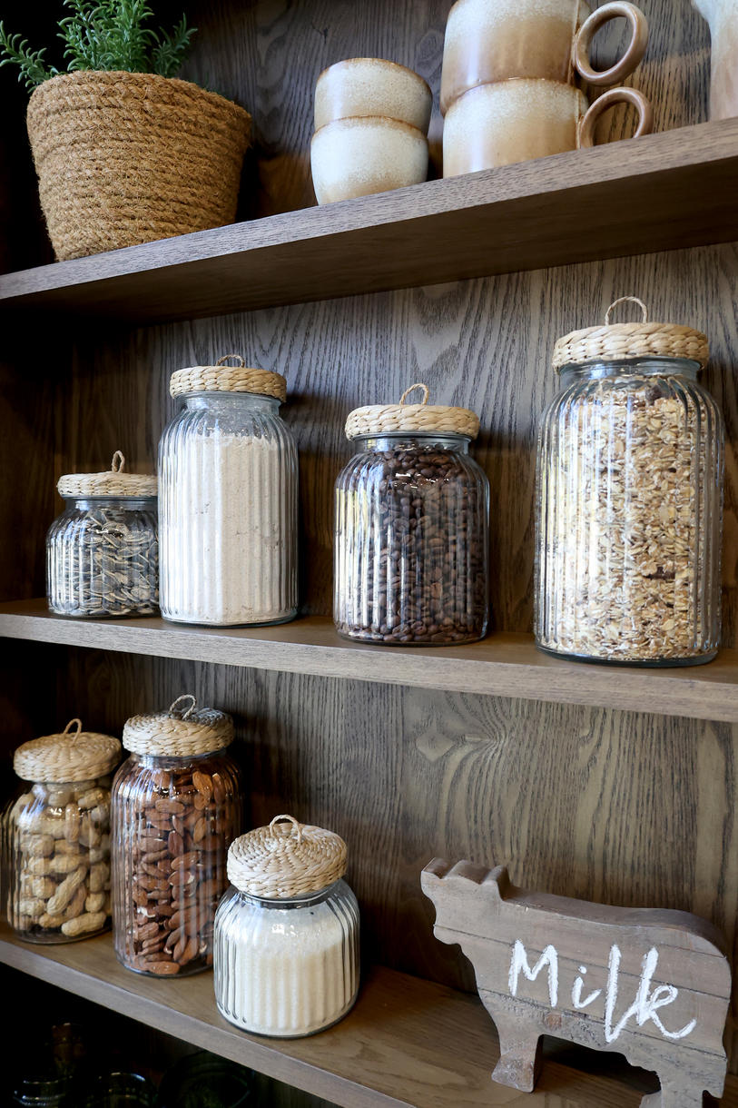 Smukt opbevaringsglas med fletlåg til stilfuld opbevaring i køkkenet.