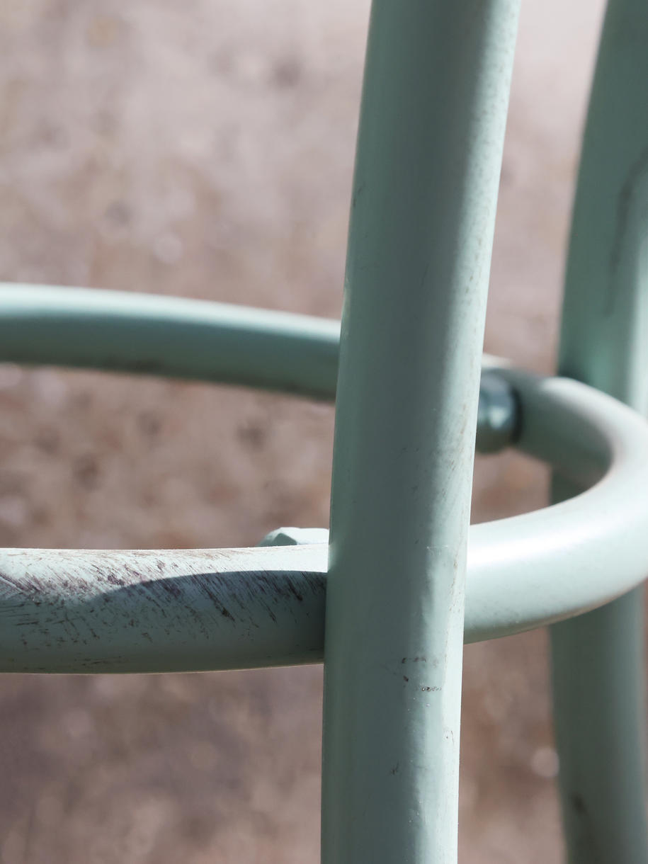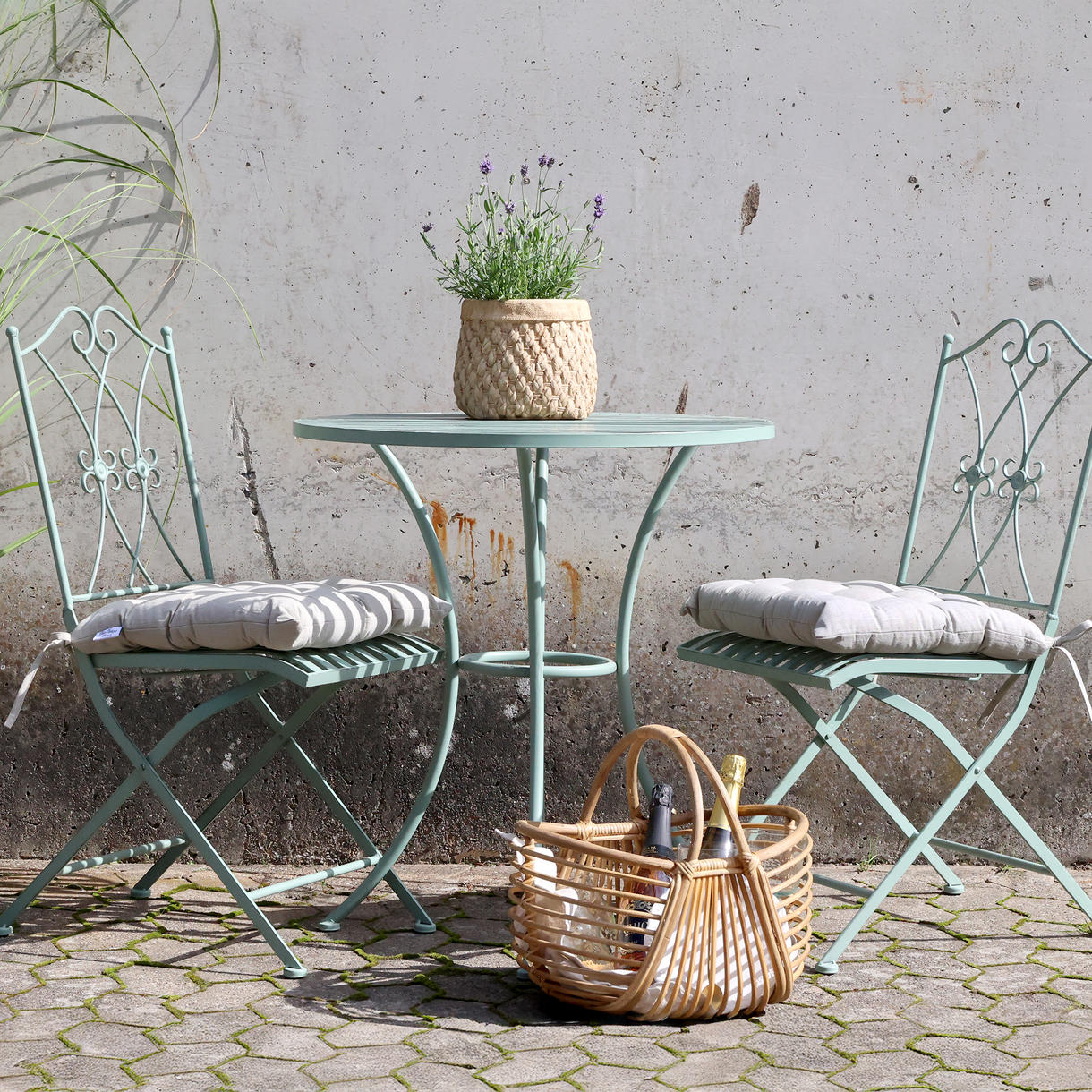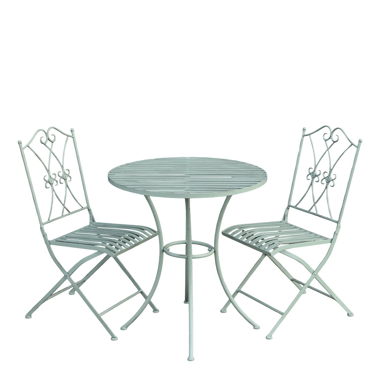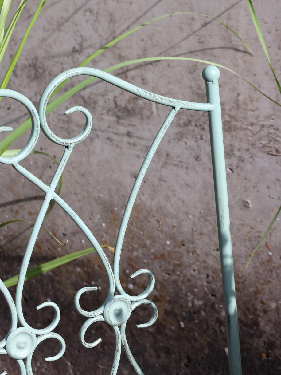 Skab en hyggelig stemning på terrasse eller altan med dette elegante cafésæt i antique verte. Den sarte grønne farve kombineret med det rå jern giver et romantisk og klassisk udtryk.
