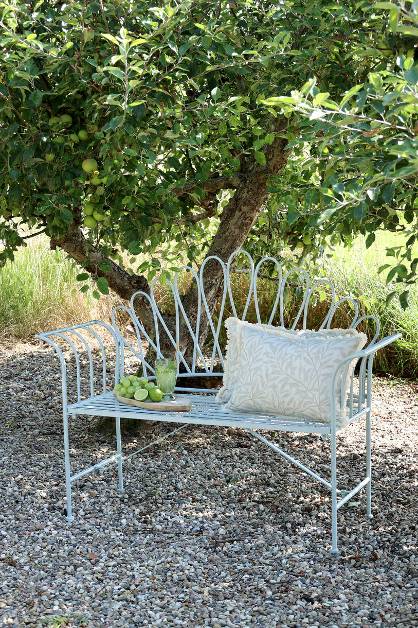 Skab en hyggelig siddeplads i haven eller på terrassen med denne elegante bænk i sky blue. Det dekorative design med buet ryg giver et let og romantisk udtryk.