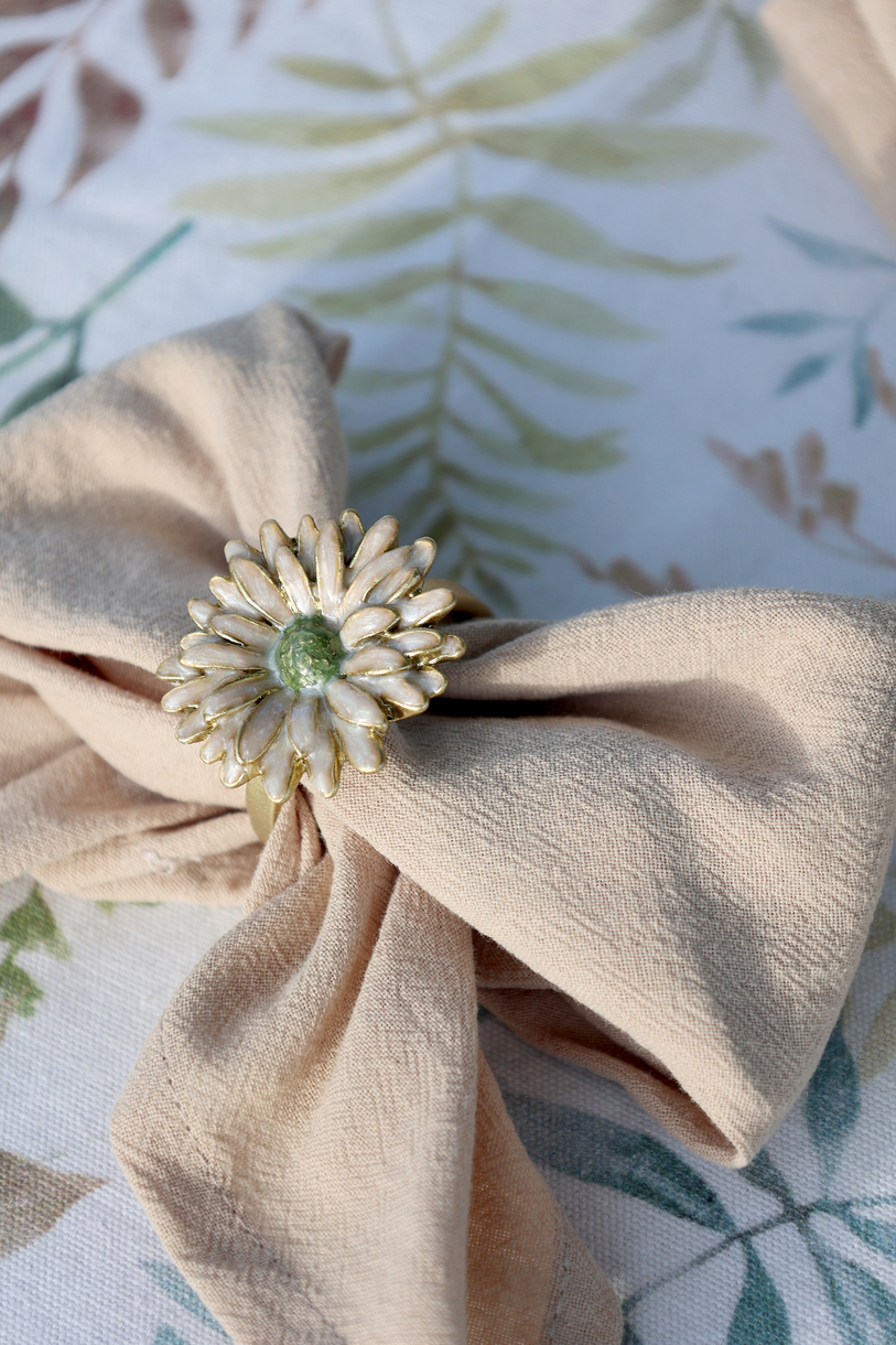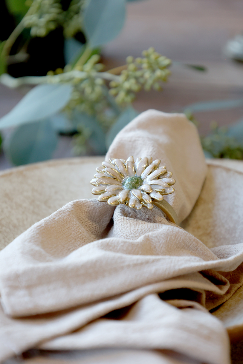 Servietring med blomst i antique creme, der tilføjer en dekorativ detalje til borddækningen. Det fine blomsterdesign giver et roligt og indbydende udtryk.