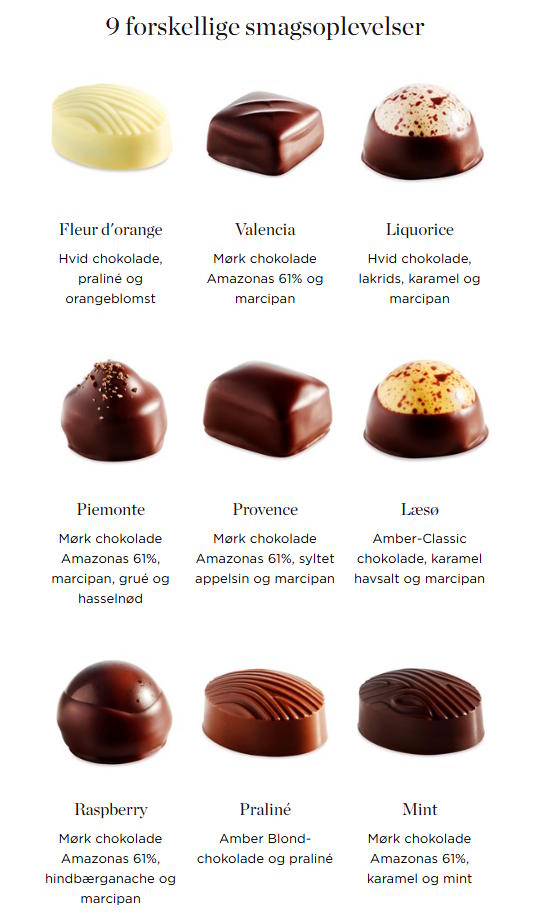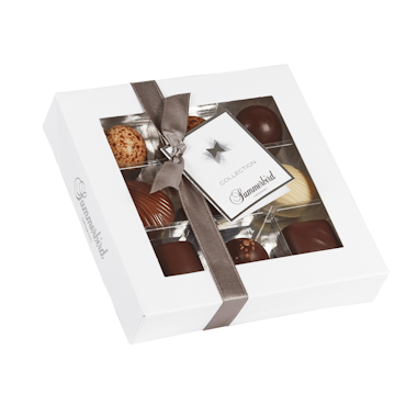 Collection 9 indeholder 9 forskellige varianter raffinerede klassiske fyldte chokolader. Æsken byder på en verden af velsmag i form af f.eks. marcipan, praliné, mynte og karamel.
