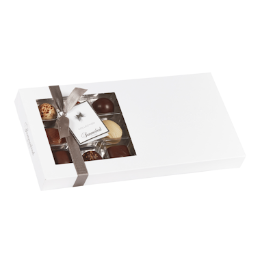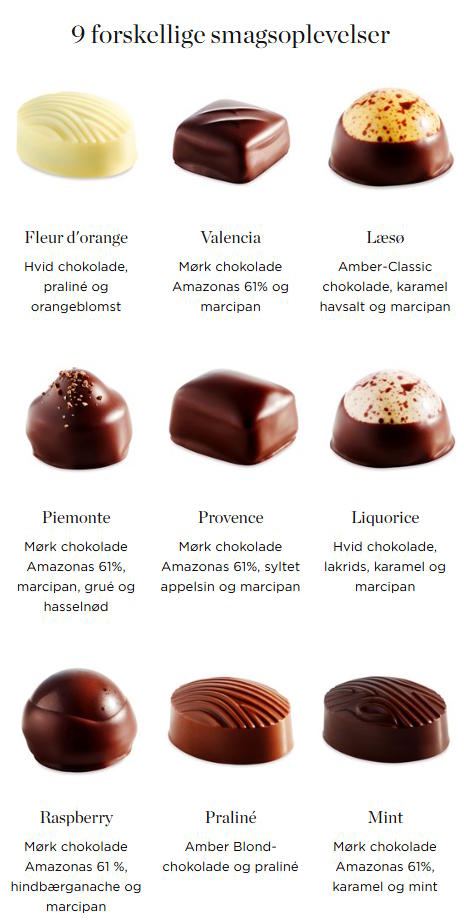 Collection 18 indeholder 9 forskellige varianter af raffinerede, klassiske fyldte chokolader. Æsken byder på en verden af velsmag i form af f.eks. marcipan, praliné, mynte og karamel. En æske, der ikke kun fungerer perfekt som gave, men i den grad egner sig til alle, som sætter pris på velsmag og høj kvalitet. Gaveæsken indeholder i alt 18 stk. chokolade.