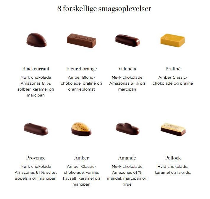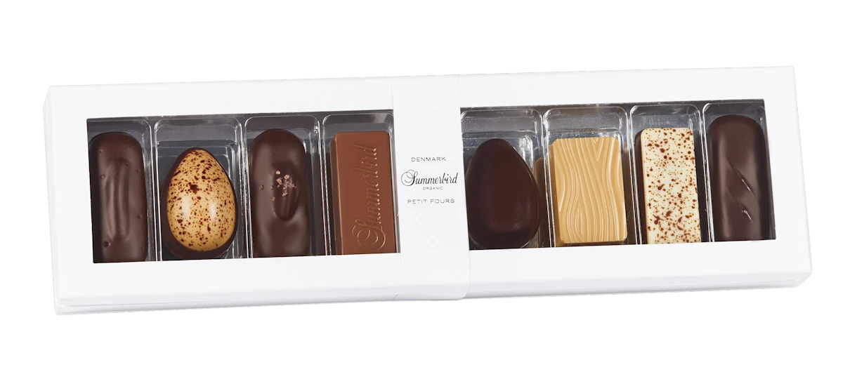 Gaveæsken indeholder 8 forskellige varianter af den ikoniske Petit Fours-stykker. Æsken byder på en verden af velsmag og egner sig perfekt til alle, som sætter pris på klassisk velsmag, godt håndværk og fantastiske råvarer. Gaveæsken indeholder i alt 8 stk. chokolade.