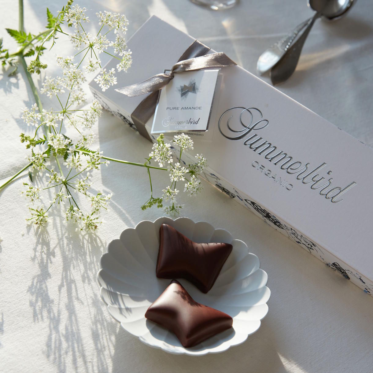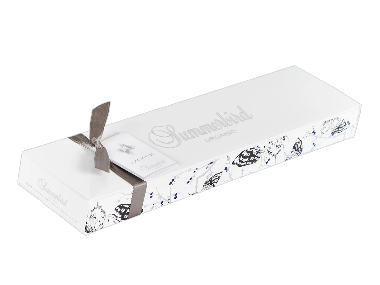 Mørk chokolade Amazonas 61 % & ren marcipan af middelhavsmandler Den ikoniske chokolade, Pure Amande, så dagens lys i 1986 og blev grundstammen for Summerbird Organic. Opskriften og filosofien er enkel: ren marcipan af middelhavsmandler, overtrukket med mørk kraftig chokolade Amazonas 61 % – resultatet er magisk. Den smukke gaveæske indeholder 10 sommerfugle. |