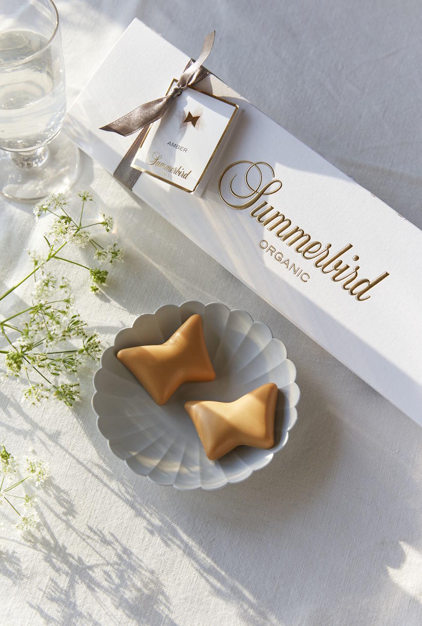 Den økologiske Amber-sommerfugle består af en raffineret og velsmagende karamel, tilsat rigelige mængder vanilje og omsluttet af den prisvindende Amber Classic-chokolade. En sommerfugl med dybde og uspoleret velsmag. Den smukke gaveæske indeholder 10 sommerfugle.