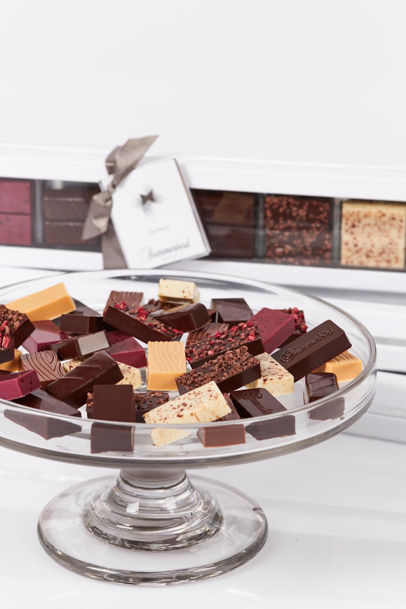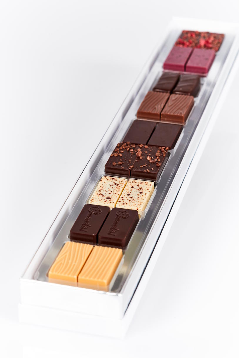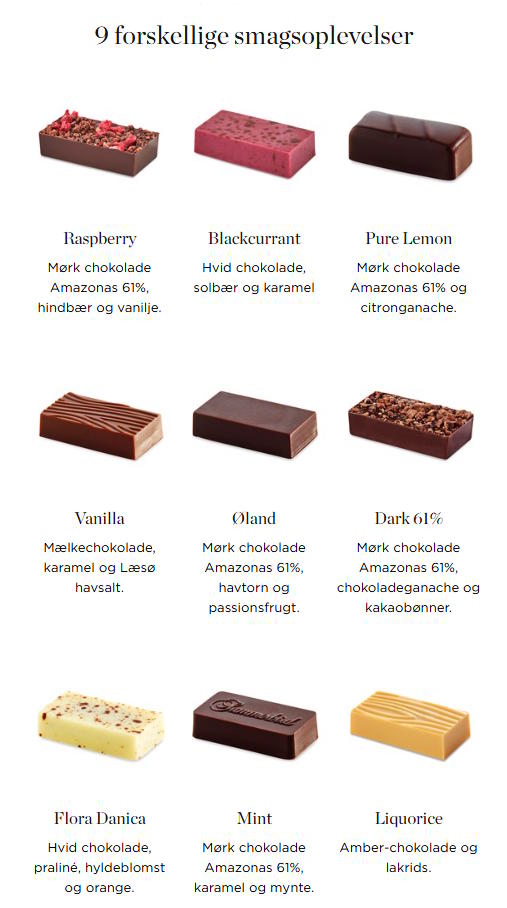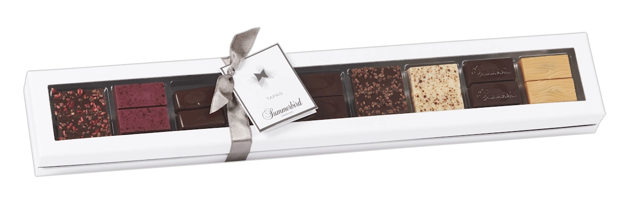 Den populærere Tapas-gaveæske indeholder en variation over små elegante stykker fyldte chokolader. Æsken byder på en verden af velsmag i form af f.eks. praliné, hindbær, mint eller passion. Ganske enkelt den perfekte æske til dem, som sætter pris på små dekadente smagsoplevelser og harmoni. Gaveæsken indeholder i alt 18 stk. chokolade.